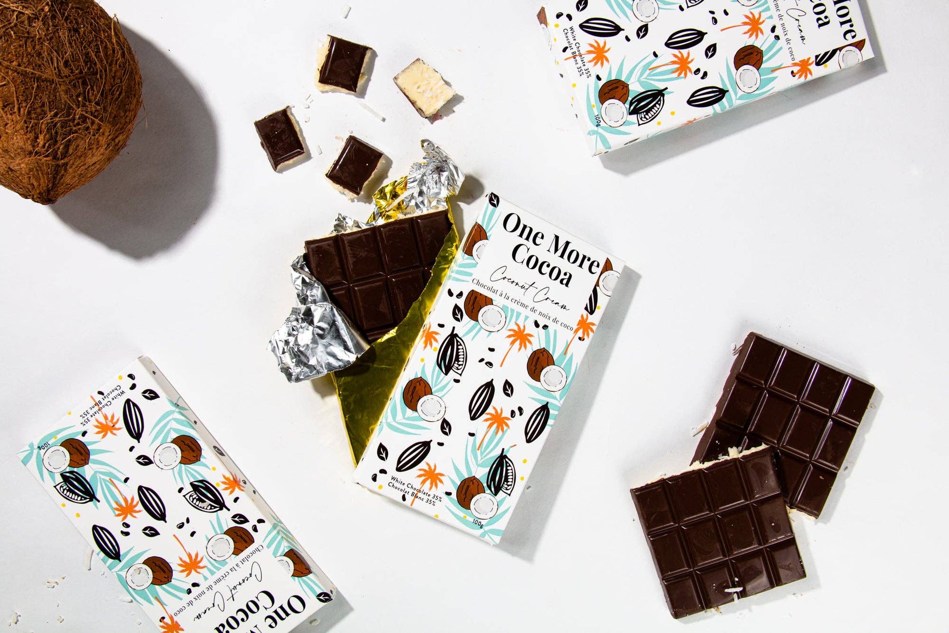 Coconut Cream bar - The ultimate coconut bar. A coconut milk chocolate base, filled with coconut white chocolate. Then topped with toasted sweetened coconut.