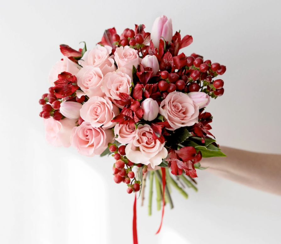 A romantic blend of stock roses, alstroemeria, hypericum, and tulips bundled together to celebrate love and affection.