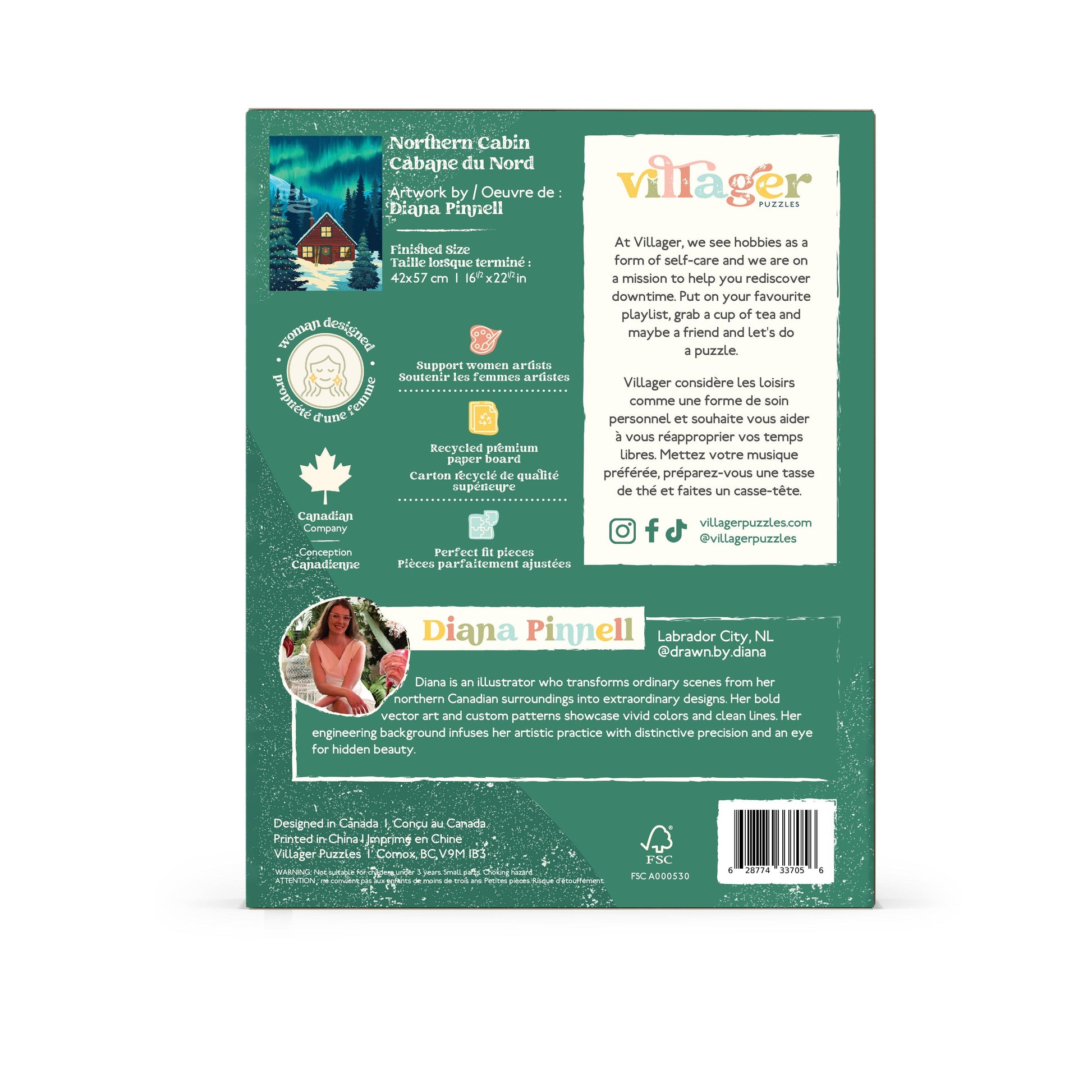 Bring the magic of a Canadian Christmas to your shelves with this enchanting puzzle featuring a cozy cabin nestled in snowy woods. Smoke curls from the chimney as the northern lights dance above, and evergreens sparkle with twinkling Christmas lights, casting a festive glow across the winter landscape—perfect for shoppers seeking a peaceful, holiday activity. Designed by Newfoundland artist Diana Pinnell, this puzzle celebrates the wonder and comfort of a northern Christmas in a modern retro style. Ideal for seasonal displays, gift guides, and holiday décor pairings.